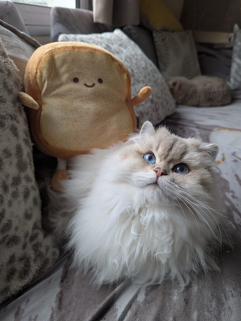 Tartine, véritable maman de l’Eden Argenté, incarne l’âme et la douceur de la famille d’Elise. Arrivée sous le nom de Saïra, elle a rapidement conquis tous les cœurs pour être affectueusement appelée Tartine. En 2023, elle a donné naissance à sa première portée, élevant avec amour six chatons d’une beauté saisissante. Maman dévouée et douce, Tartine symbolise l’aboutissement des années de passion et d’expérience d’Elise dans l’élevage félin. Son rôle de génitrice dévouée a ajouté une nouvelle dimension à l’histoire magique de l’Eden Argenté, faisant d’elle un pilier essentiel de cette famille féline exceptionnelle.