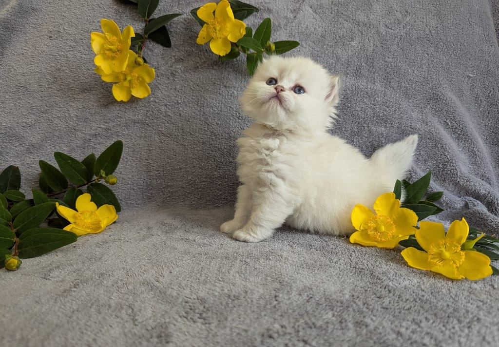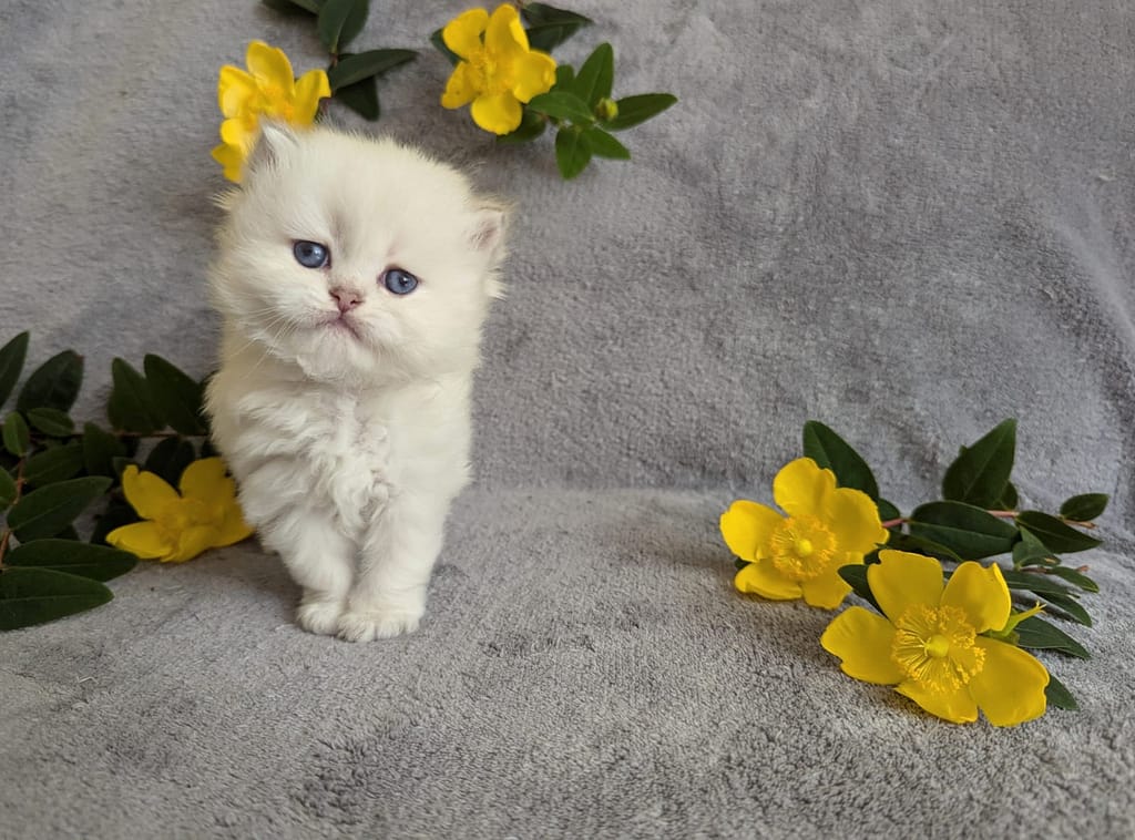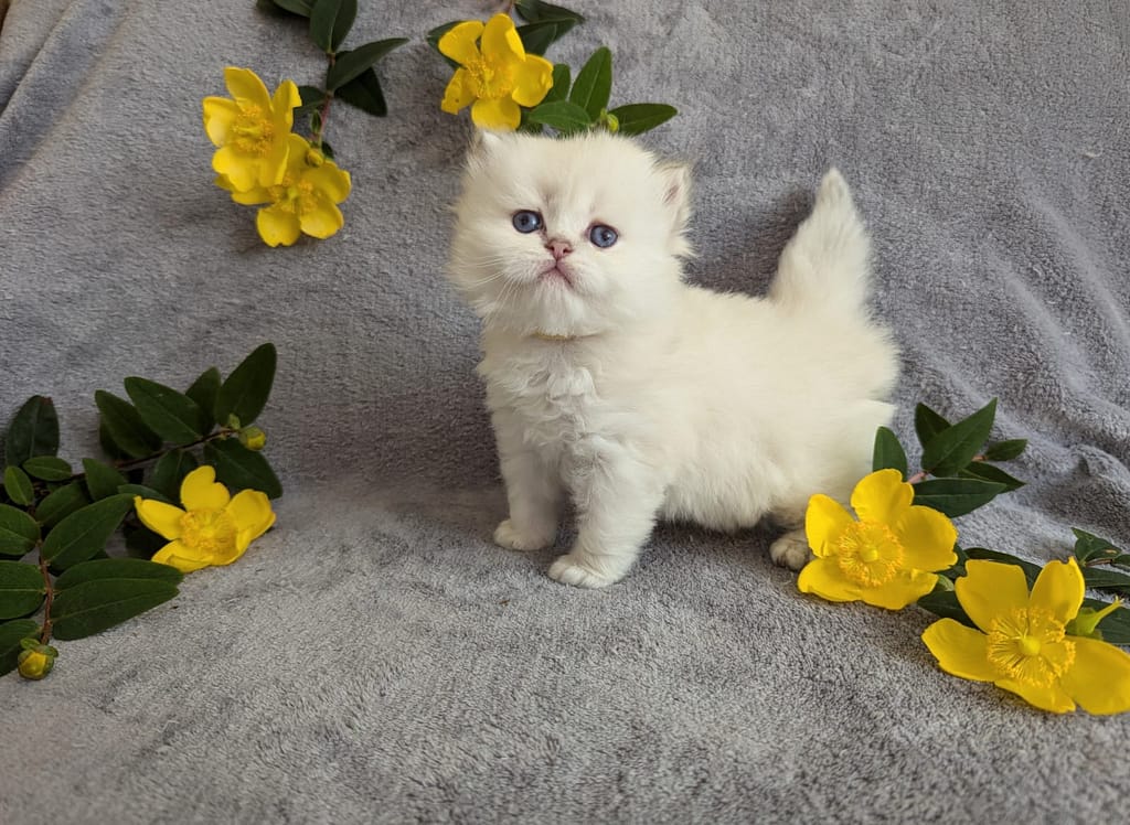 Yuzu, avec son nom inspirĂ© du cĂ©lèbre agrume japonais, est un adorable chaton British Longhair nĂ© Ă  L’Eden ArgentĂ©. Son pelage soyeux et ses grands yeux bleus le rendent irrĂ©sistible.